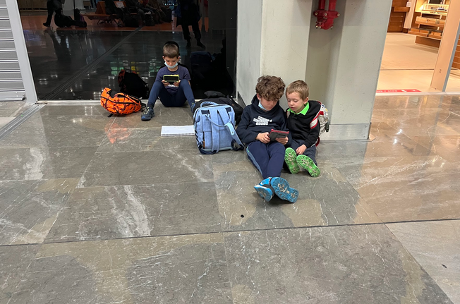 L'escale à Madrid nous permettra de manger (oui encore, ça revient tellement souvent cette activité que ça en deviendrait presque pénible...) et de faire un peu d'école allongés dans un coin d'aéroport.