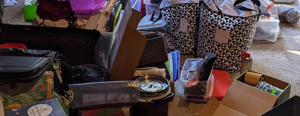 Grosse étape du jour : le chargement On avait prévenu nos familles, attention la 3ème guerre mondiale peut se déclencher dans un garage !!! En réalité, le chargement de la remorque s'est déroulé de façon plutôt sereine. Nous avons fait 3 tas dans le garage (Mamie Cathy s'inquiétait tellement quand elle a vu l'ampleur de la chose qu'elle a préféré quitter les lieux et peut-être se boucher les oreilles au cas où même de loin on nous entende !!!) :