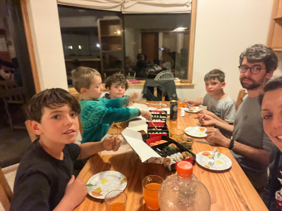 C’est bien vrai, nous avons mis le nez dehors, posés nos fesses dans le 4x4 pris la jolie route qui mène à la Colonia Suiza où nous avons déguster une fondue, fait un petit tour dans le centre, constaté que c’était un endroit très touristique où autrement dit « attrape couillon », repris le 4x4, rentrés à la maison, constatés qu’il y avait de fortes rafales de vent indiquées à 50 km/h !!! (Qu’est-ce que ça va être à 110-120 dans une remorque), terminé la bouteille de vin « Aimé » en regardant Tom danser sur les musiques qu’il mettait lui-même sur Spotify (goût moyen, je ne sais pas de qui il tient pour ça celui-là ?!?), joués à la belote avec les deux grands alors que les deux petits étaient tranquillement dans le bain (après avoir rallumé la chaudière que Tom avait éteint !!!) en attendant le repas : risotto.